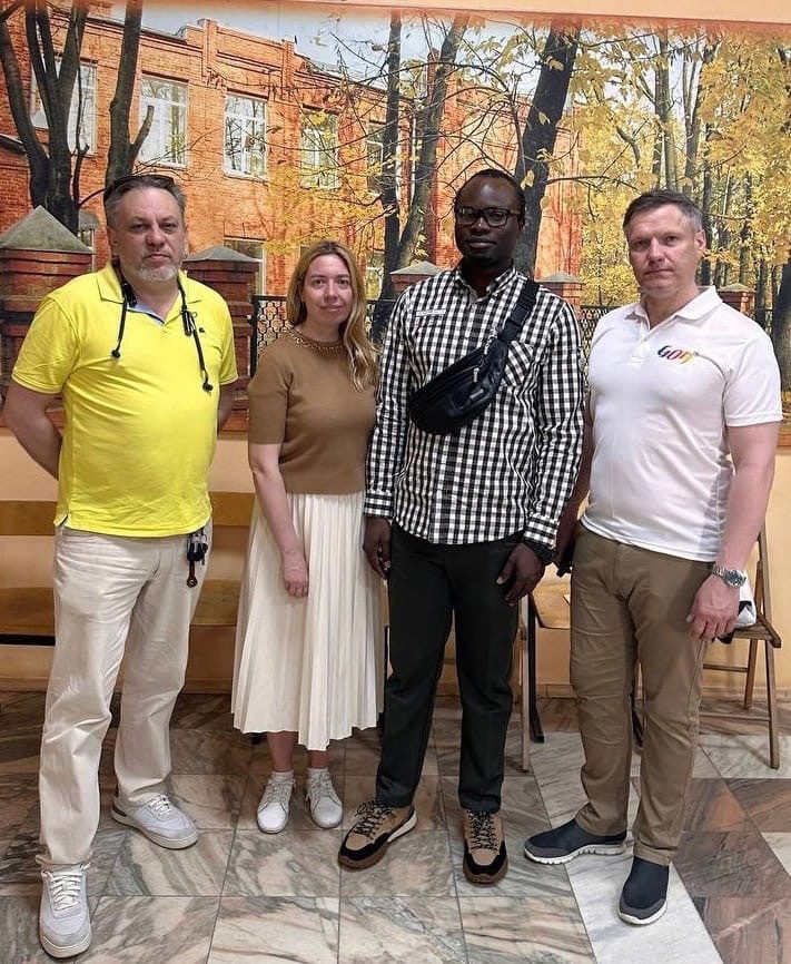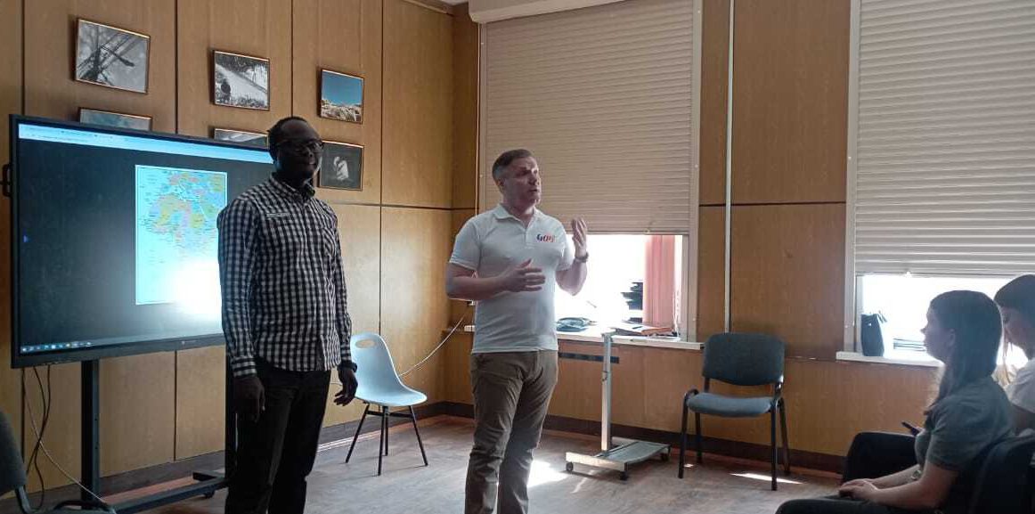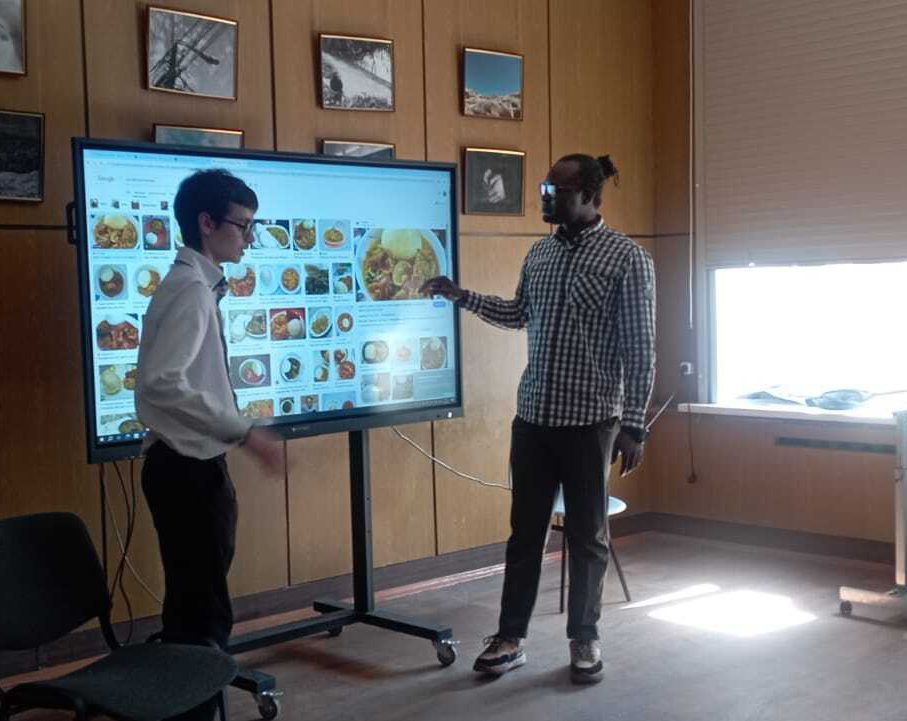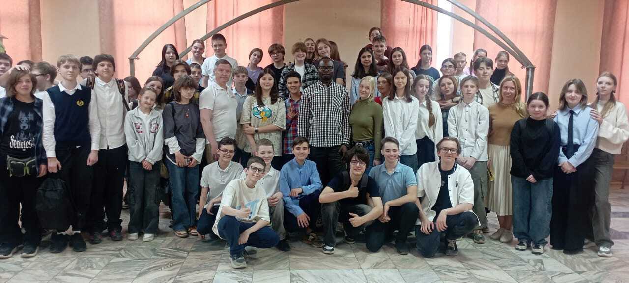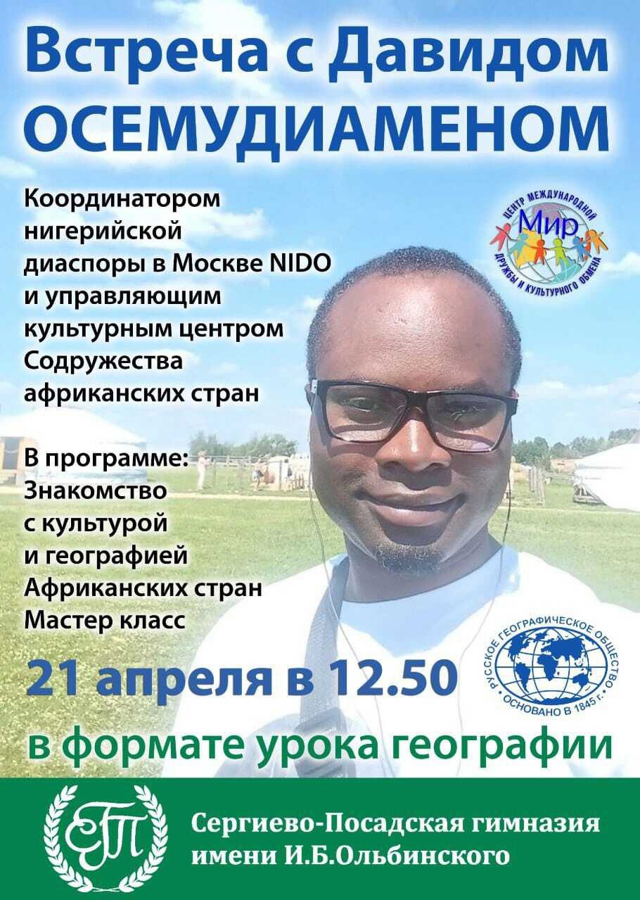 Переводчиками на этой встрече были гимназисты 9 класса Меркулов Сергей и Смирнова Варвара. Но к концу занятия их помощь уже не понадобилась — всех объединила музыка. Гимназисты спели вместе со своим гостем сначала настоящую африканскую песню, а потом — нашу «Катюшу». Благодарим за организацию наших друзей по туристическому клубу: Ирину Чулкову – аккредитованного гида – переводчика музеев Московского Кремля, основательницу туристического агентства по приему иностранцев в России “Moscow Navigator”, преподавателя английского языка, Льва Печенко – соучредителя центра Международной дружбы и культурного обмена, преподавателя русского языка как иностранного, режиссёра-педагога, члена Хотьковского краеведческого общества, и Попову Анну, участницу Молодежного парламента округа. Встреча была организована учителем географии Филатовым Д.М. с участием председателя Сергиево Посадского отделения Русского географического общества Александра Шульгина и Королёва А.В.
